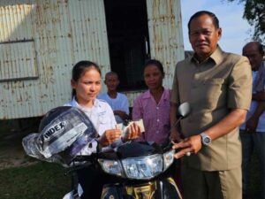 ព្រៃវែង÷នាព្រឹកថ្ងៃទី ១ ខែធ្នូ ឆ្នាំ ២០២៣ ឧកញ៉ា ជឹម សុខ ប្រធានសភាពាណិជ្ជកម្មខេត្តព្រៃវែង និង លោកជំទាវ បាននាំយកម៉ូតូហុងដាសេរីថ្មី ១គ្រឿង និងថវិកា ១លានរៀល ឧបត្ថម្ភដល់ក្មួយស្រី សាំ ស្រីថន ដែលប្រលងបាក់ឌុបជាប់និទ្ទេសA ក្មួយស្រី ជាកូនកំព្រាឪពុក រស់នៅជាមួយម្ដាយម៉េម៉ាយនិងបងប្អូន ៦ នាក់ មានជីវភាពខ្វះខាតខ្លាំង រស់នៅភូមិ ក្រសាំងចារ ឃុំ សេនារាជឧត្ដម ស្រុក ព្រះស្ដេច ខេត្ត ព្រៃវែង…
